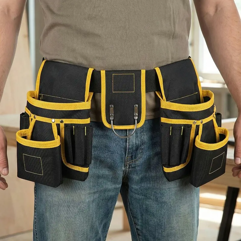I wear this pouch on long shifts wiring houses. The padded band saves my hips, and I can grab tape, cutters, screws without looking down.