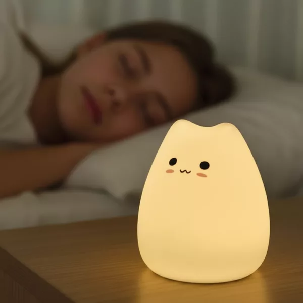I keep the kitty lamp on my own nightstand. The gentle glow lets me read a little and still fall asleep easily afterward.