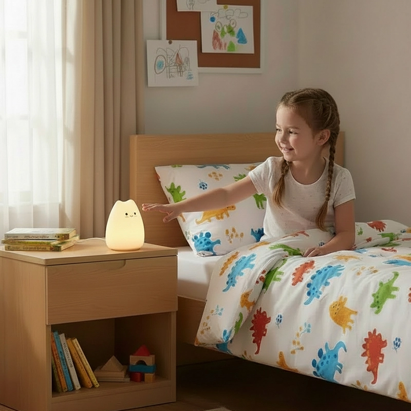 My son was scared of the dark, but this cat light changed our nights. The soft glow and squishy body make him feel calm and safe.