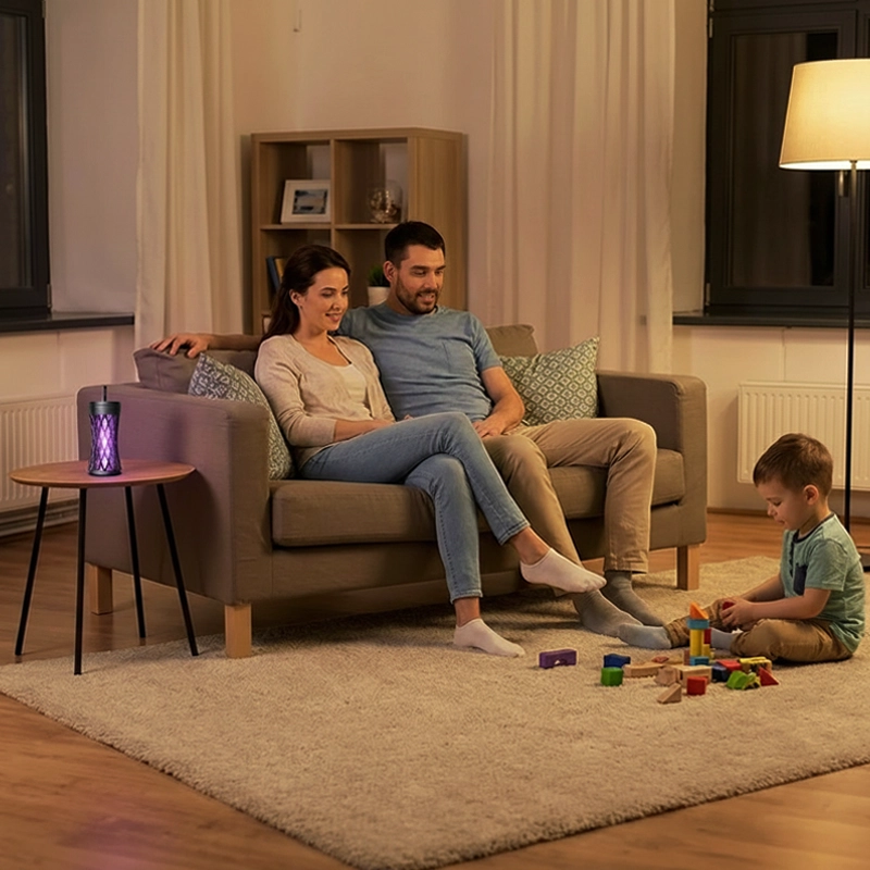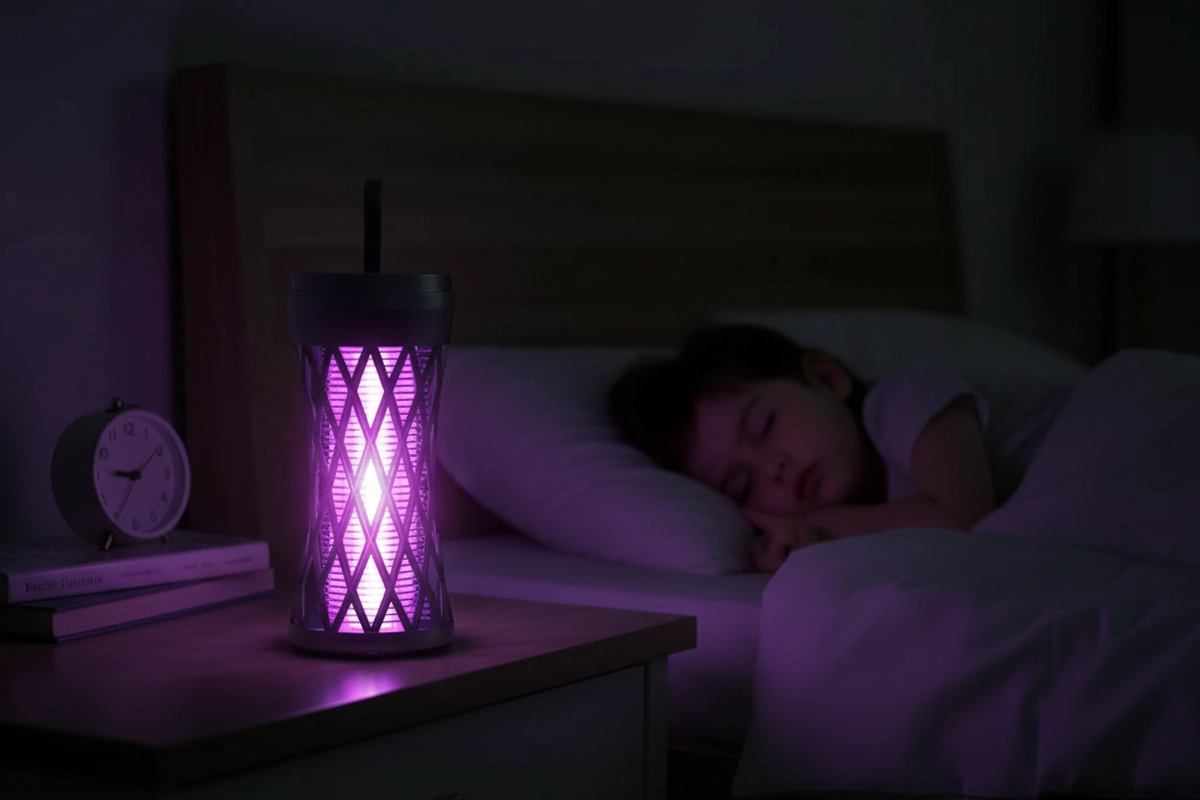 My husband and I use this lamp in our small apartment bedroom, and the quiet hum and dark light keep everything calm and bug‑free.