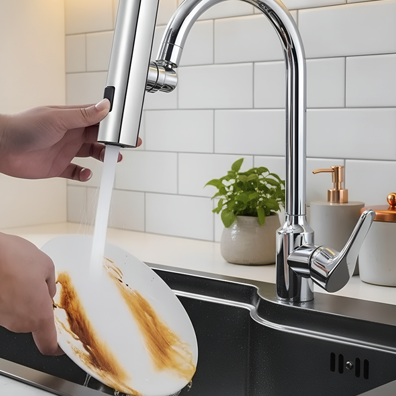 No more splashes! I can switch from a gentle rinse for fruit to a strong spray for pans in one second. Even my kids can use it.