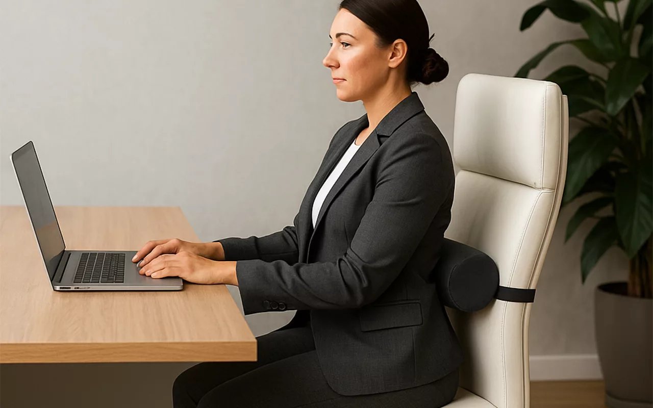Encourage a healthy spine position during long work hours. Maintain correct alignment and avoid slouching or fatigue.