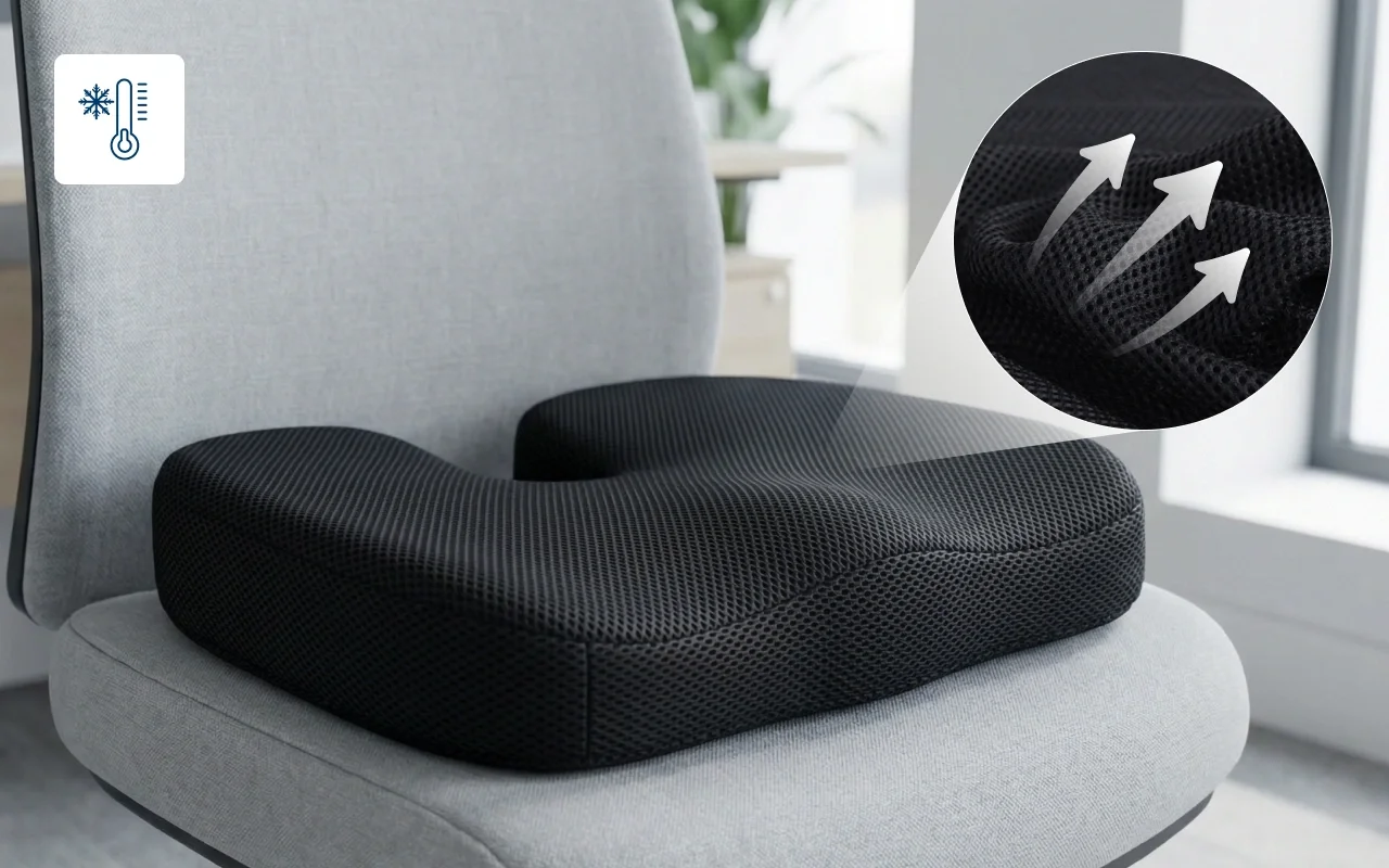 I use this every day at my desk. My tailbone pain faded after a week, and the cooling top keeps me from getting sweaty during long meetings.