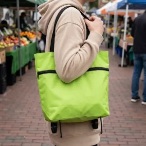 Our shopping cart holds several bags worth without sagging dangerously. Durable fabric resists tears, keeping fruit, bread, and bottles protected.