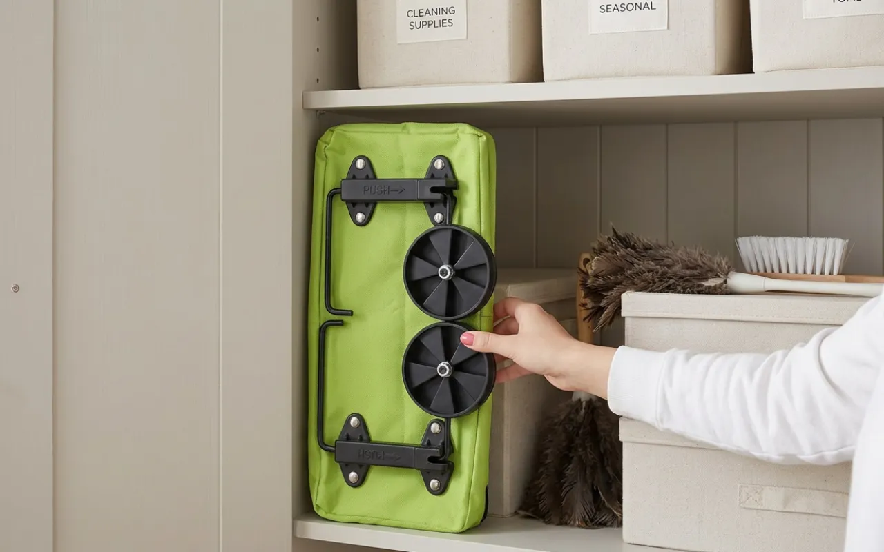 Got this cart after my shoulder surgery. Now I load heavy bottles and fruit without worrying. It folds in seconds and slides beside the wardrobe easily.
