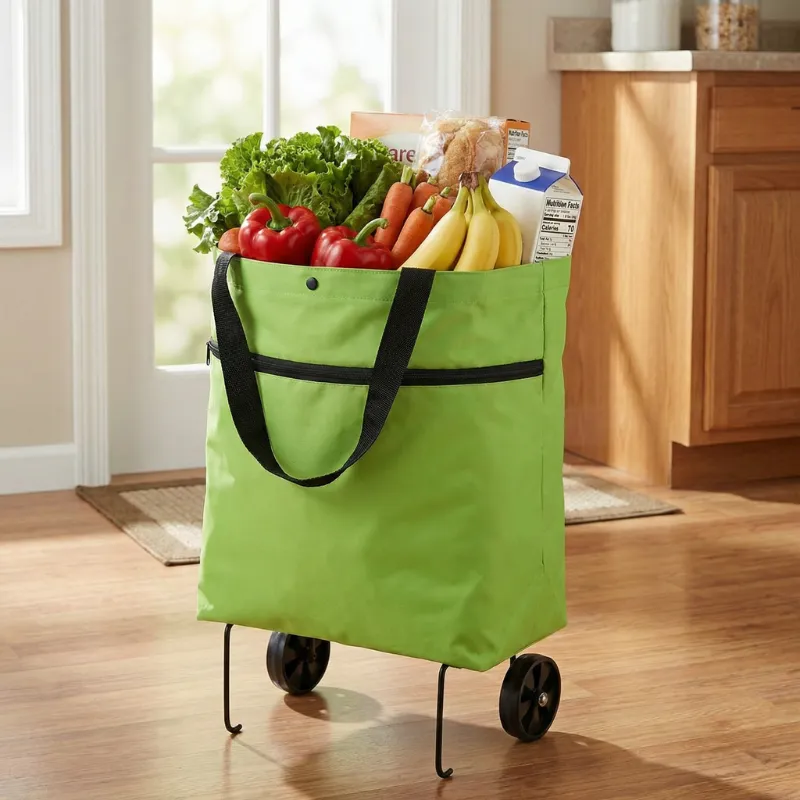 I push this cart to the supermarket twice a week. It carries milk, bread, veggies, and cleaning stuff easily. The sturdy bag keeps everything from tipping over.