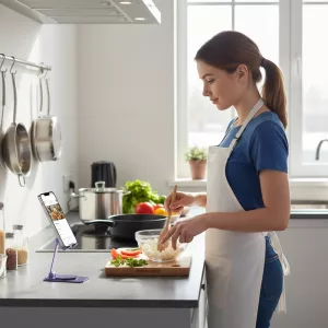I keep this stand on my kitchen counter for recipes and video calls cooking. It tilts smoothly and cleans my whole workspace.