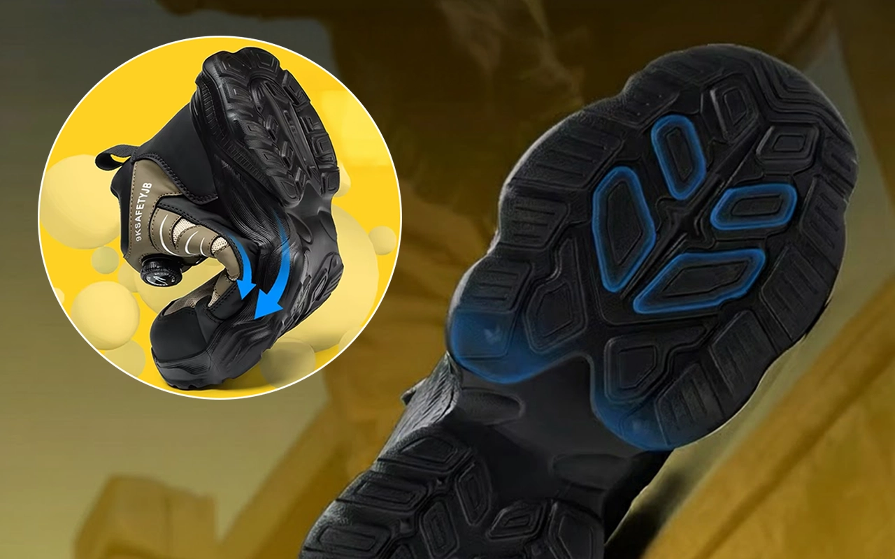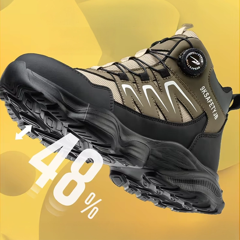 Steel reinforcement guards toes from falling tools or debris. Stab-resistant sole blocks sharp objects from reaching your feet.