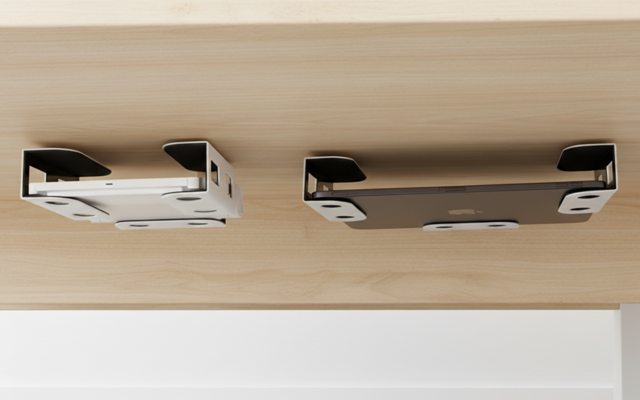 Easily fits laptops, small computers, and TV boxes under desks. Flexible sizing adapts quickly to different shapes or brands.
