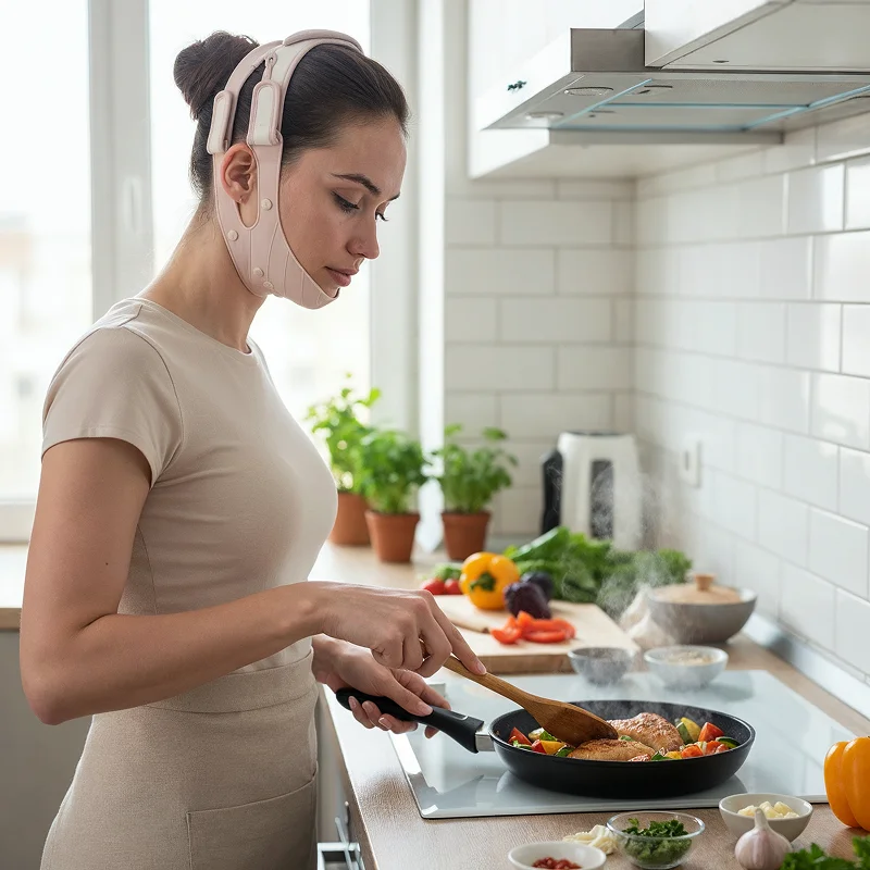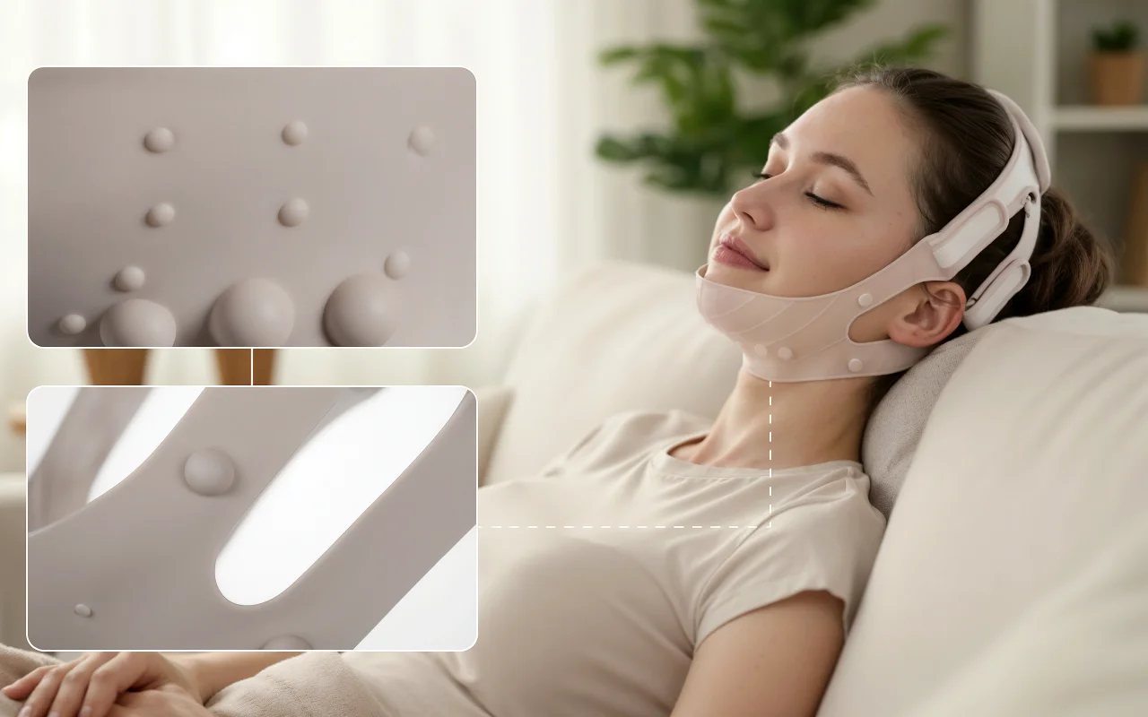 I wear this lifting band while reading at night, and my jawline already looks sharper. Soft silicone, no pinching, and my cheeks tighter.