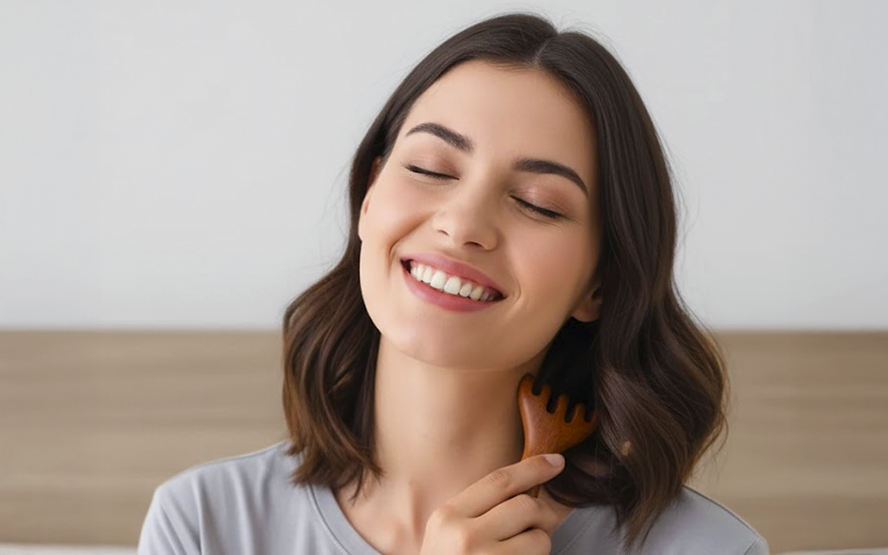 Gentle, rounded teeth massage the skin and ease tightness. Feel refreshed as tension melts away with every stroke.